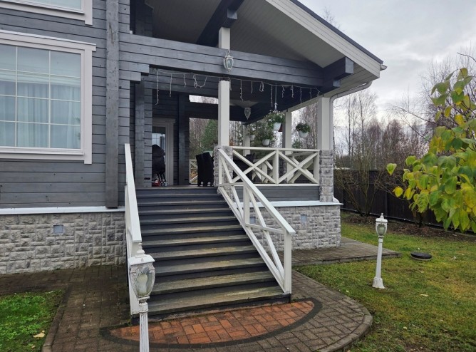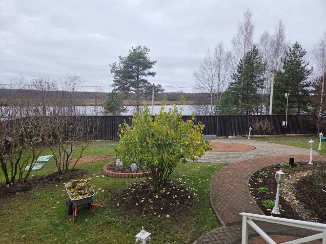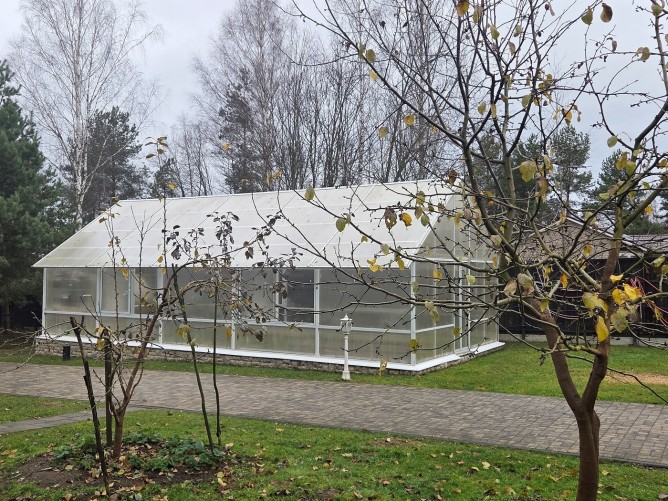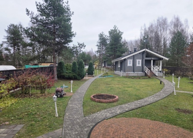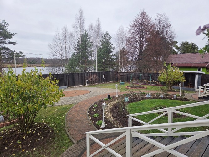5. Домовладение расположено на земельном участке 50 соток (0,5 Га). Территория огорожена. Забор металлический из профлиста по всему периметру на бетонном фундаменте из армированной ленты. Дорожки и площади вокруг домов выложены брусчаткой. Внешние светильники и освещение. Ландшафтный дизайн. Декоративные растения, клумбы, цветы, сосны, туи. Разнообразные садовые деревья, яблони, сортовая клубника, смородина, крыжовник. Дренажная система по периметру. Автополив на ТЕПЛИЦУ с отоплением и садовые насаждения.