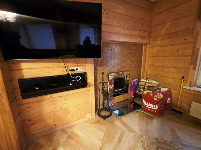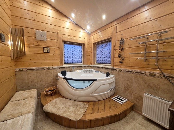 2. БАНЯ-шале из клееного бруса 200х350 площадью 66 м2 с чугунной печью-камином: просторная сауна/парная с закрытой каменкой, предбанник, помывочное отделение, комната с джакузи, мини-кухня, комната отдыха, санузел с душевой кабиной. Год постройки 2014. Для бани установлен газгольдер.