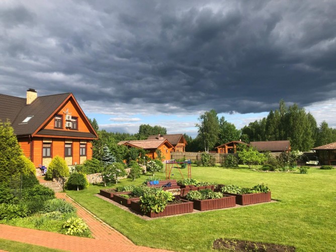 Общая площадь земельного участка 61 сотка (6124 м2). Дорожки из камня. Клумбы. Ландшафтный дизайн. Огород с двумя стационарными теплицами, яблоневый сад, много декоративных насаждений: туи, гортензии, розы, пионы.