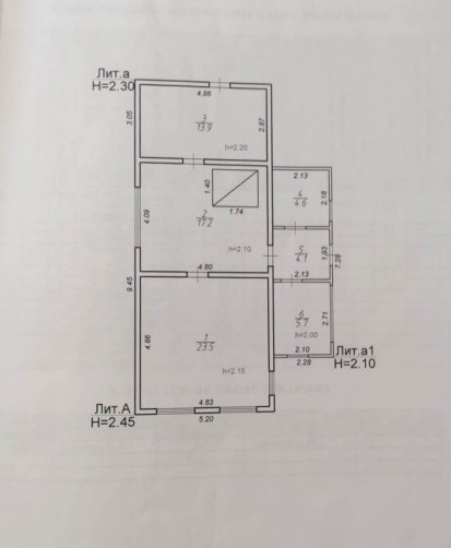 Планировка: три комнаты 23,5 / 17,2 / 13,9 м2, коридор 4,1 м2, две веранды 4,6 и 5,7 м2, подпол и чердачное помещение под отделку. Средняя высота потолков 2,15 м.
